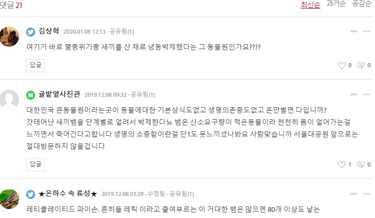 2020년 1월 14일 현재 서울동물원 이달의 동물 '그물무늬왕뱀' 게시판 댓글