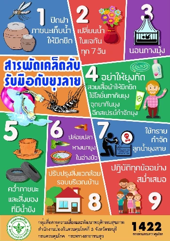 태국 정부가 펼치는 모기 피해 방지 캠페인. 물구덩이를 없애고 모기약을 바르고 모기장을 치자는 내용입니다.