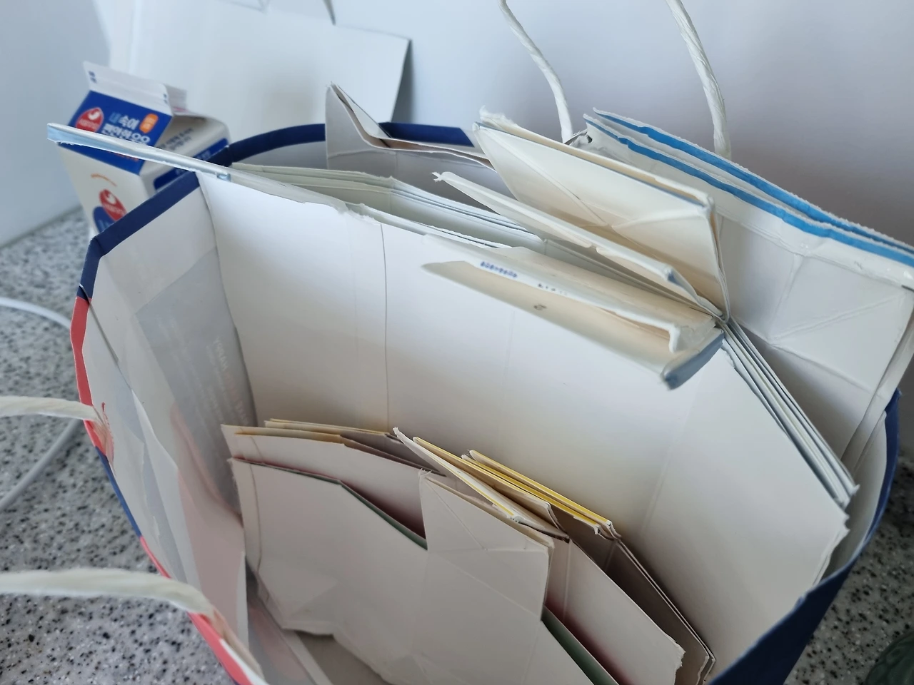 가장 중요한 것은 가정에서 번거롭더라도 우유팩은 따로 모아서 버리는 것이다. 번거롭다고 해봤자 한번 헹구어 엎어놓으면 알아서 마르는 것이고, 그 뒤 초등학교 시절을 떠올리며 직육면체 전개도 모양으로 잘라내면 되는 것이다. 한 귀찮음 하는 나 역시도 날 잡고 가위질을 한다. 대충 헹구어 뒤집어 말린 후, 뒷배란다에 대충 던져 놓았다가 시간 여유가 생기는 날 하루에 몰아서 잘라 정리 하는 것이다.