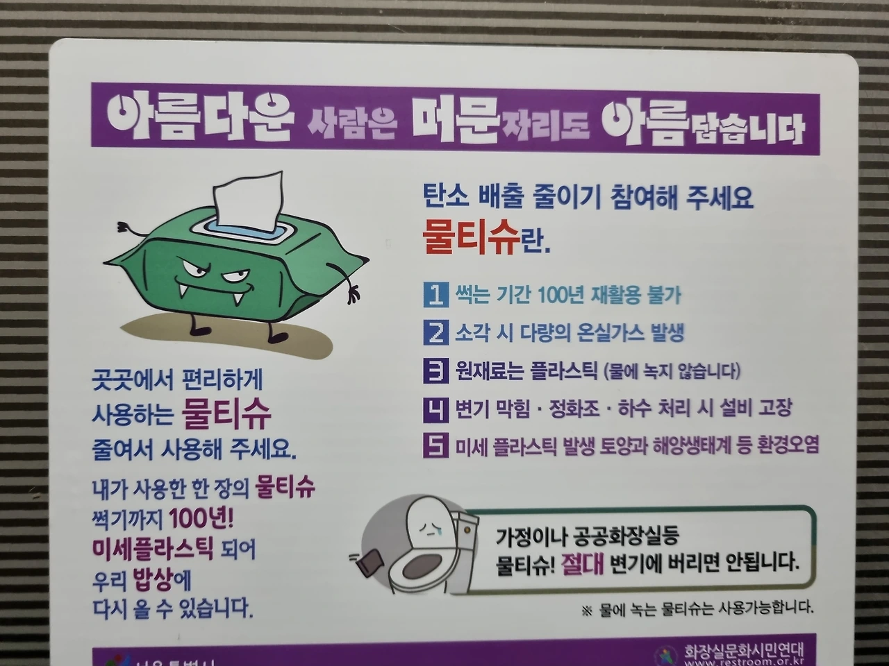 물티슈를 박스로 사서 쓴다. 행주 빨기 귀찮을 때, 간단히 먼지 닦을 때 등 실생활의 다양한 부분에서 사용하고 있다. 강아지를 키우던 시절에는 산책 후 늘 물티슈로 강아지 발을 닦아주었고, 내 신발에 묻은 얼룩도 물티슈를 이용해 지우곤 했다. 그리고 아무 생각 없이 늘 쓰레기통에 집어 던져 버렸다. 그 덕분에 우리집 일반 쓰레기의 대부분은 늘 물티슈가 차지하고 있었다. 단 한번도 물티슈를 버리는데 죄책감을 가져보지 않았다.