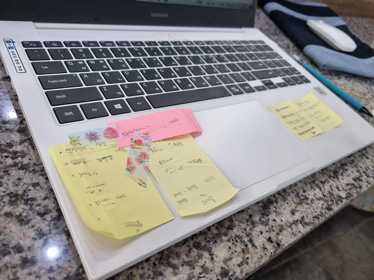 뜨개질을 하며 메모를 시작하자 몸이 메모하던 기억을 떠올리기라도 한 것인지 메모하는 일이 다시 습관처럼 몸에 자리잡기 시작했다. 집에 굴러다니던 수첩에 하루 하루 할 일을 적기 시작했고, 구매해야 하는 물건들을 포스트잇에 적어 노트북에 붙여 두었다. 연구를 하면서 문뜩 문뜩 생기는 궁금증도 포스트잇에 적어 노트북에 붙인다. 노트북이 노란 포스트잇으로 가득 찬다. 하나하나 지워나가는 쾌감을 다시 한 번 느껴본다.