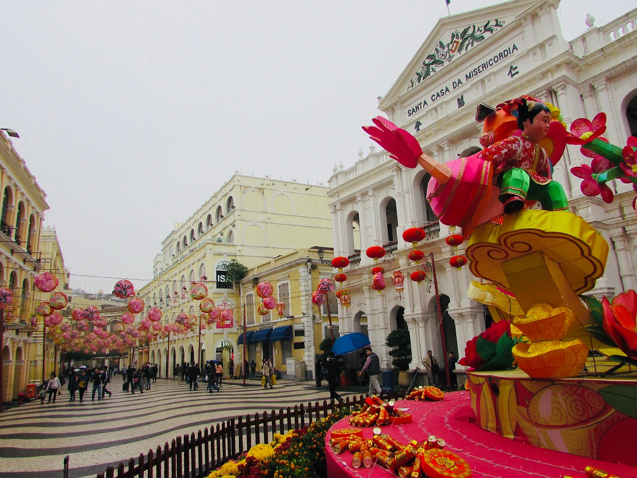 이따금 가랑비가 얇은 셔츠 위로 떨어진다. 약간의 추위가 느껴진다. 3월의 마카오지만 비 오는 날은 쌀쌀하다. 바닥을 보니 파도 모양의 타일이 흑백으로 깔려 있다. 포르투갈 전통 무늬인 '타일 칼 사드'이다. 구정이 지난 지 얼마 되지 않은 지 황금색과 붉은색으로 치장된 용과 양들이 광장 중앙에 설치돼 있다.