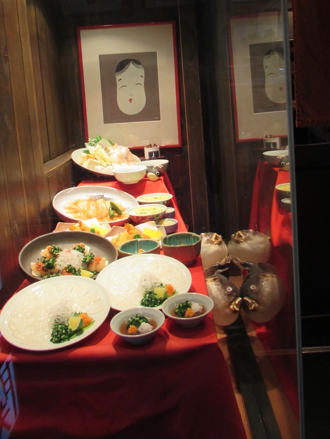 정말 먹거리의 대향연이었다. 진열 유리창에는 음식 조형물들이 아기자기한 형태로 구미를 당겼고 무엇보다 각각의 가게 특성을 나타내는 간판들이 흥미로웠다. 어떤 것은 하나의 예술 조형물로 보였다. 푸른 껍질이 꿈틀대는 용과 붉은색의 대계, 검은색 황소 한 마리와 귀여운 북어 한 마리가 간판에 걸려있다. 익살스러운 만화 캐릭터들이 간판을 대신하기도 한다.