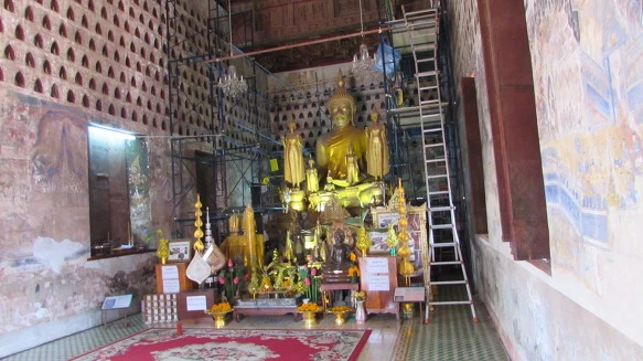 사원 출입문의 윗부분은 낡고 곰팡이가 핀 나무가 매달려 있다. 여기저기 전깃줄이 거미줄 마냥 엉켜 있다. 황금색 기둥과 겹겹이 내려앉은 지붕은 날렵한 제비의 날개 같고 지붕 맨 위에는 닭 모양의 물상이 있다. 대법전 '씸'은 신발을 벗어야 들어설 수 있다. 정중앙에 불상을 모시고 주변에는 작고 낮은 불상들이 모여 있다. 내부 균열과 붕괴를 방지하기 위해 철골구조물을 설치해 두었다.