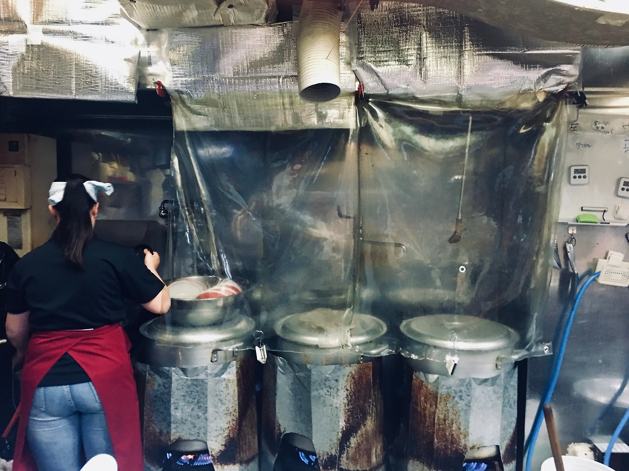 그리고 식당 내부를 두리번두리번 거리자 유명인들의 방문 기념 사인판들이 벽면에 부착돼 있고 정면에는 라멘 육수를 끓이는 원통형 가마솥이 뜨거운 김을 내뿜고 있다.