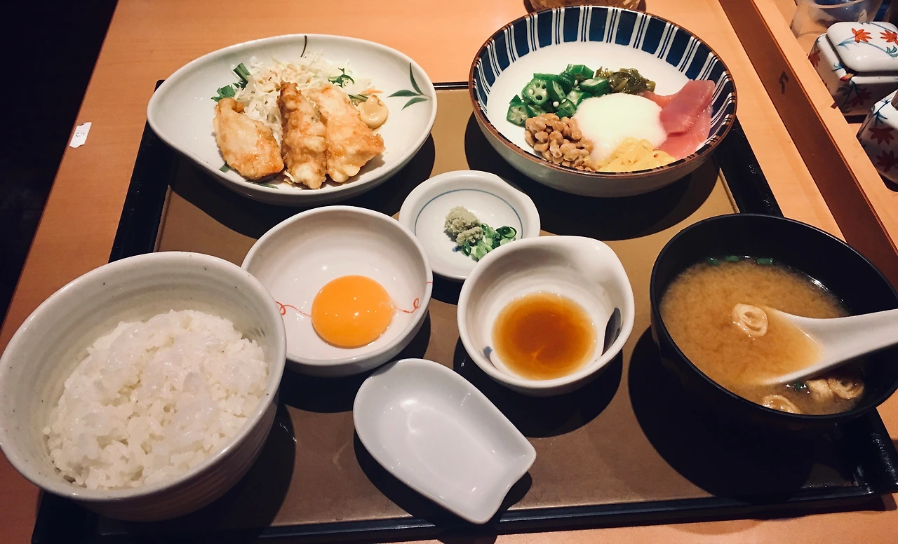 흰쌀밥, 날계란, 된장국, 붉은 참치살과 낫토(일본 전통 콩 발효식품), 고추, 미역 등이 담긴 사발과 가라아게(닭고기 튀김)를 내놓았다.