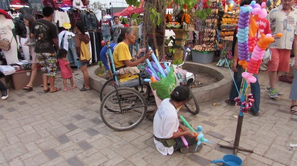 각종 고기구이와 튀김, 볶음밥, 쌀국수, 바게트 등 먹을거리들이 진수 성찬식으로 펼쳐져 있다. 나는 그저 보기만 할 뿐 선뜻 어느 것 하나 사지도 먹지도 못하고 있다. 단지 라오스 기념품 정도 구입할 생각이었다. 상점 주인들은 조용히 자리를 지키고 있을 뿐 서울 남대문 시장처럼 구매를 강요하는 호객행위는 일절 없었다. 손님이 가격을 물어보면 묵묵히 대답만 할 뿐이다. 가족의 생계와 행복을 위해 치열하게 사는 모습에서 삶의 숭고함을 엿볼 수 있다. 낡은 휠체어에 앉은 까만 손의 노파는 막대 풍선을 불며 예쁜 풍선 장식을 만들고 있다. 길바닥에 퍼져 앉은 여인도 허리춤에 전대를 두르고 풍선을 만지작거리고 있다. 한 여인은 종이 방석을 깔고 물바가지를 내밀고 노래를 부르고 있다. 어린 소녀는 풍선 장난감을 가득 안고 인파 속에서 헤엄치고 있다.