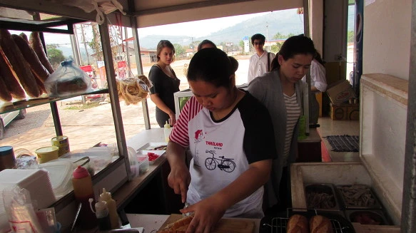 그녀는 별다른 반응도 없이 아주 천천히 그리고 매우 정성스럽게 두껍고 긴 빵 안에 갖가지 양념들을 넣기 시작했다. 그리고 비닐로 싸서 내게 전해준다.