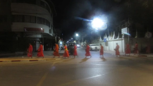 새벽 5시 일어났다. 탁발을 보아야 한다. 라오스 여행의 목적 중의 하나이다. 루앙프라방의 탁발이 유명하지만 이번 여정에는 없다. 비엔티안에서 보지 못하면 기회는 없다. 나는 무턱대고 밖으로 나갔다. 어제 메콩강에서 사라진 태양은 떠오르지 않았다. 고요한 푸른 새벽이다.