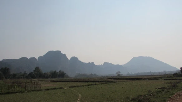 방향을 블루 라군 쪽으로 잡자 카르스트 지형이 만들어 낸 석회암 산이 희미하게 보인다. 라오스의 계림이라고 불리는 팟타오 산이다.