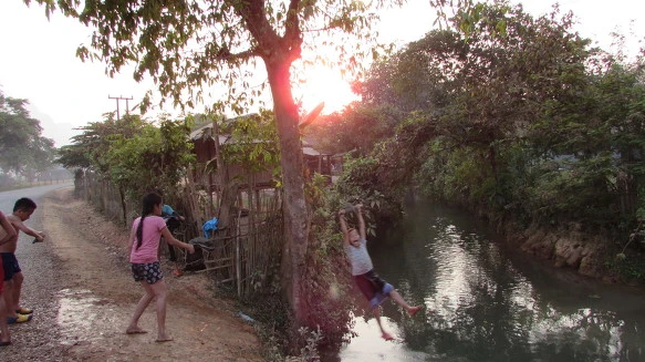 먼지 나는 도로를 열나게 달리고 있을 무렵 아이들의 웃음소리와 함께 진정한 블루라군을 만났다. 어린 소년과 소녀들이 타잔처럼 줄을 매달려 개울 위를 날고 있었다. 동네 앞을 흐르는 강물은 블루빛은 아니지만 아이들에게는 진정한 블루라군이었다.