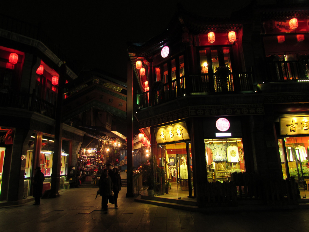 전반적으로 역시 첸먼다제는 어둡다. 가로등 불빛은 여행객들의 기쁨과 지친 표정을 조명하지 못하고 검은 실루엣만 보일 뿐이다. 온통 쇼핑 건물은 홍등을 내걸었고 쇼윈도는 중국식 복장과 전통 가구, 각종 먹거리들을 내걸고 있다. 보행자 도로는 어둡고 상점은 밝은 빛 자체이다.