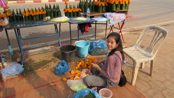나는 꽃 파는 처녀 앞에 섰다. 스물두셋 정도 보이는 아가씨이다. 양반다리를 하고 빠르게 손을 놀리고 있다. 그녀의 몸을 가릴만한 그늘은 거의 없다. 이미 판매대 위에는 30개 정도의 꽃들이 진열돼 있다. 이 많은 것들을 오늘 다 팔 수 있을까. 더구나 이렇게 꽃 파는 가게들이 많은 데 말이다.