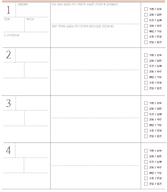 남기고 싶은 경험이 생겼을 때 딱 3분, 해당 상황을 스캔하며 아래 3단계로 기록한다.