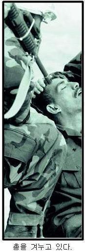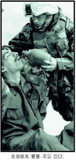 똑같은 사진인데 왼쪽 사진은 포로에게 물을 주고 있고 오른쪽은 총을 겨누고 있다.