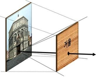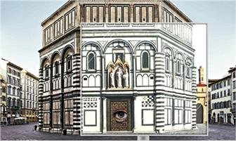 피렌체 두오모 광장에서 젊은 브루넬레스키가 실험을 하고 있다. 한 손엔 세례당 그림을, 한 손엔 거울을 들고 있다. 그림으로 얼굴 앞을 가리고 거울 든 손은 앞으로 뻗어 위치를 맞추고 있었다. 가만 보니 그림 아래쪽에는 구멍이 뚫려있다.