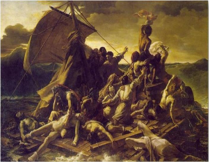 실제 일어난 사건을 모티브로 한 제리코의 그림을 보면 지옥을 보는 듯하다. 우리에게 익숙한 가슴 아픈 세월호 사건을 떠오르게 해서 한 층 더 참혹하고 비극적으로 다가온다. 살아남기 위한 아비규환 자극적이고 긴박한 상황 이를 표현하기 위해서 실제로 제리코는 시체를 해부했다고 한다. 그림을 보는 순간 마치 그 현장에 있는 듯한 생생하고 격렬한 감정을 느낄 수 있다. 실제 사건을 모티브 했지만 작가가 관찰하고 그린 그림이 아니라 화가 본인의 상상력과 내면의 감정을 표현한 것이다. 어지러운 대각선 구도와 색채의 대비는 극한 감정을 한 층 더 끌어올린다.