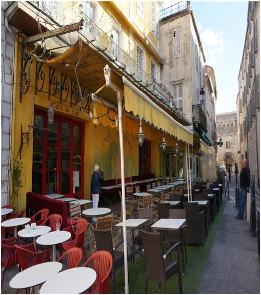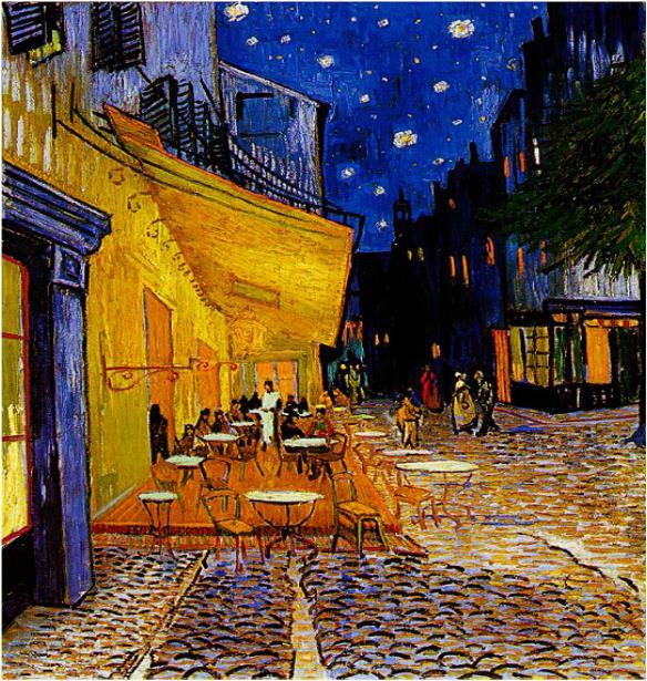 <아를의 포룸 광장의 카페테라스>를 보면 작품 속 풍경은 눈에 비추어진 대로 그린 것이 아니라 고흐의 격정적이고 불안한 내면의 상태를 ’ 밖‘으로 표현한 것이다. 실제 카페테라스 사진과 비교해보면 형태와 색이 심하게 왜곡되어 있음을 느낄 수 있다.