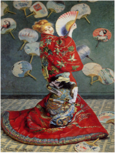 또한 모네는 <기모노를 입은 카미유> 르누아르는 <부채를 든 소녀>에서 일본풍의 색채와 형태를 찾아볼 수 있습니다. 또한 파격적인 구도와 두꺼운 윤곽선 비스듬한 각도의 우끼 요예는 새로운 영감을 주기에 충분했다.