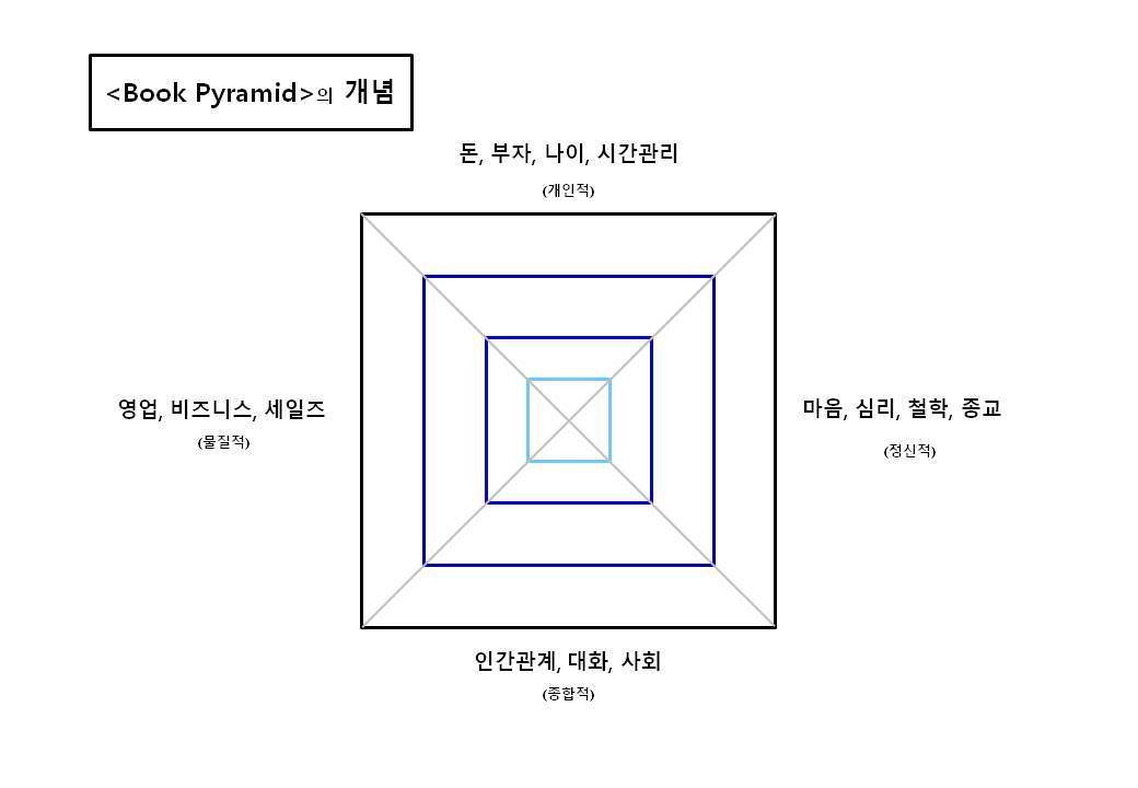 나는 나만의 피라미드를 다음과 같은 개념으로 정리하였다. 물질적인지, 정신적인지, 지극히 개인적인지 사회 종합적인지 그렇게 피라미드의 네 방향을 정하고 나름의 균형을 맞춰서 지금까지 책을 읽어오고 있다.