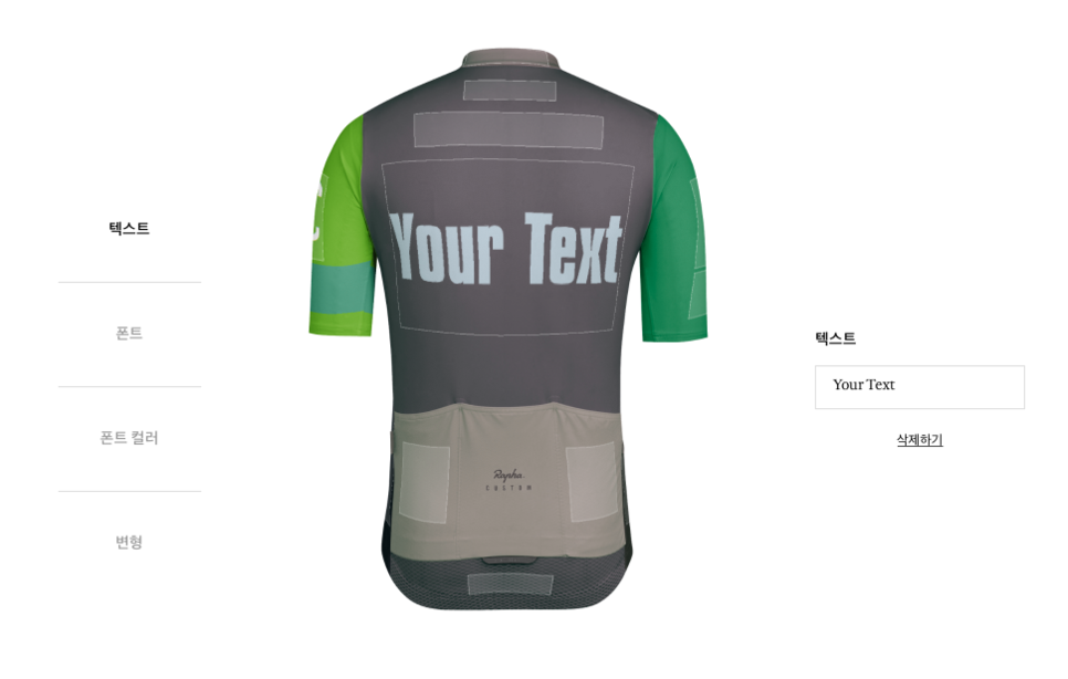 완전한 비스포크 형식이 아니라 라파에서 제공하는 툴을 이용하여 레이아웃, 색상, 패턴, 크기, 각도, 로고, 타이포를 이용해 수많은 경우의 수를 만들어내는 시스템을 만들었습니다. 그 경우의 수가 너무나 많기 때문에 로고나 타이포를 제외하더라도, 똑같은 의류는 거의 나올 수 없을 것으로 예상됩니다.