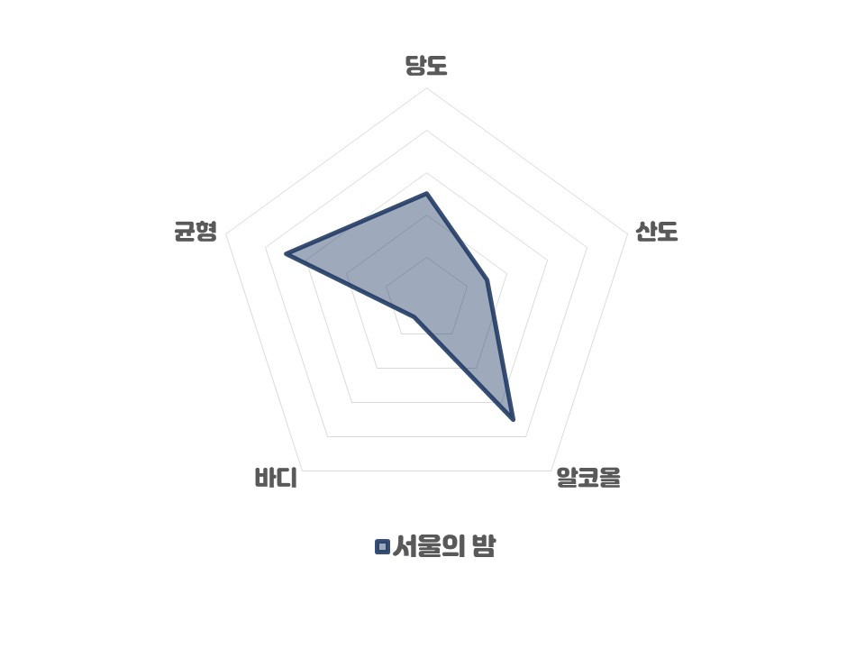 서울의 밤의 식품유형은 리큐르입니다. 리큐르는 쉽게 말해 증류주를 베이스로 하여 만든 혼성주인데요. 매실을 이용해 얻은 증류주에 벌꿀, 포도당, 주니퍼베리라는 감미료 및 약초 등을 첨가하여 가공시켜 만들어진 술입니다. 전반적으로 부드럽지만 지배적인 진의 느낌을 가졌으면서, 보드카처럼 한 번의 강렬함 끝에 느껴지는 풍부함을 느끼게 해 줍니다. 베이스가 제법 부드럽기 때문에 다른 어느 것들과도 잘 어울릴 수 있고, 여러 방식으로 변형해 마셔봐도 좋은 술이라 생각합니다.