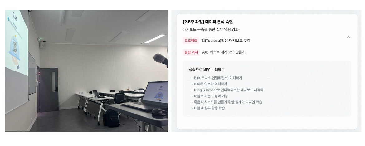 스파르타 코딩 클럽에서 튜터로 일하면서 부트캠프 데이터 1기 태블로 VOD 강의를 촬영했었습니다. 실습이 많았던 태블로 강의를 만들면서 학습자 입장을 고려해서 강의 내용을 어떻게 잘 구성하고 전달할 수 있을까?에 대해 여러번 고민하고 실행해볼 수 있었습니다.