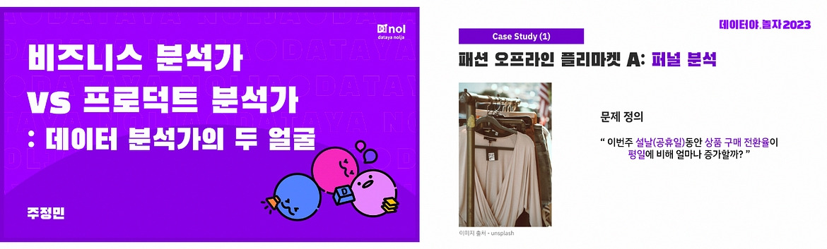 작년 10월 데이터야놀자에서 <비즈니스 분석가 vs 프로덕트 분석가>: 데이터 분석가의 두 얼굴을 주제로 발표를 했습니다. 데이터야놀자에서 그동안 여러 회사를 다니면서 비즈니스와 프로덕트를 기반으로 데이터 분석한 경험들을 가상의 사례로 치환해서 발표했습니다. 데이터야놀자 연사분들과 함께 강연한 내용 일부가 deep daiv에서 책으로 출판될 예정입니다.