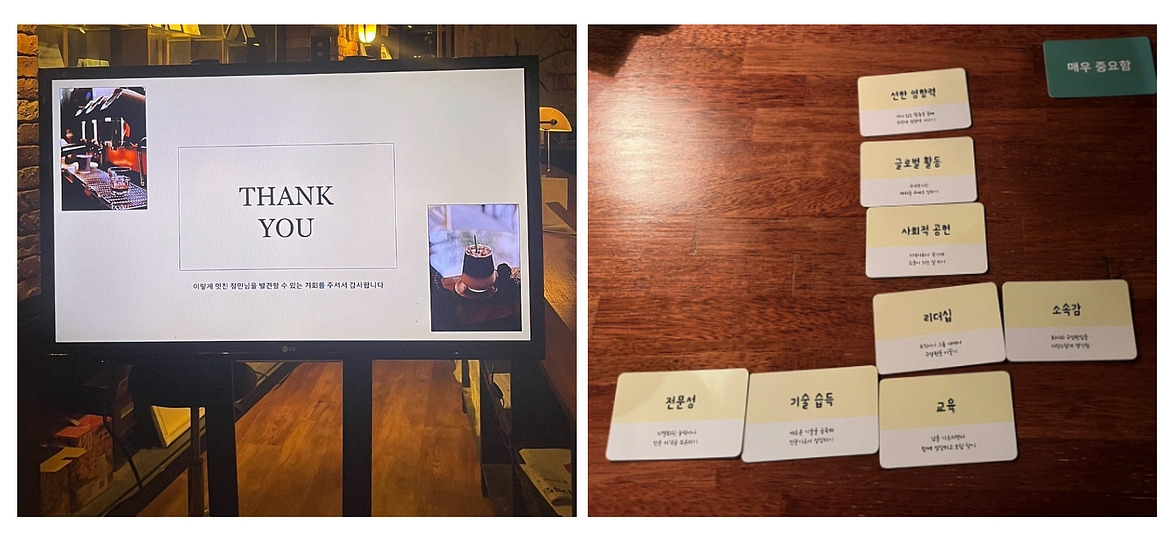 강점 워크샵, 버크만 진단 등 여러 검사들을 진행하면서 현재 내가 원하는 것과 나에게 중요한 것이 무엇인지를 알아갈 수 있었습니다. 강점 워크샵 결과 선한 영향력, 글로벌 활동, 전문성이 매우 중요함으로 뽑았습니다.