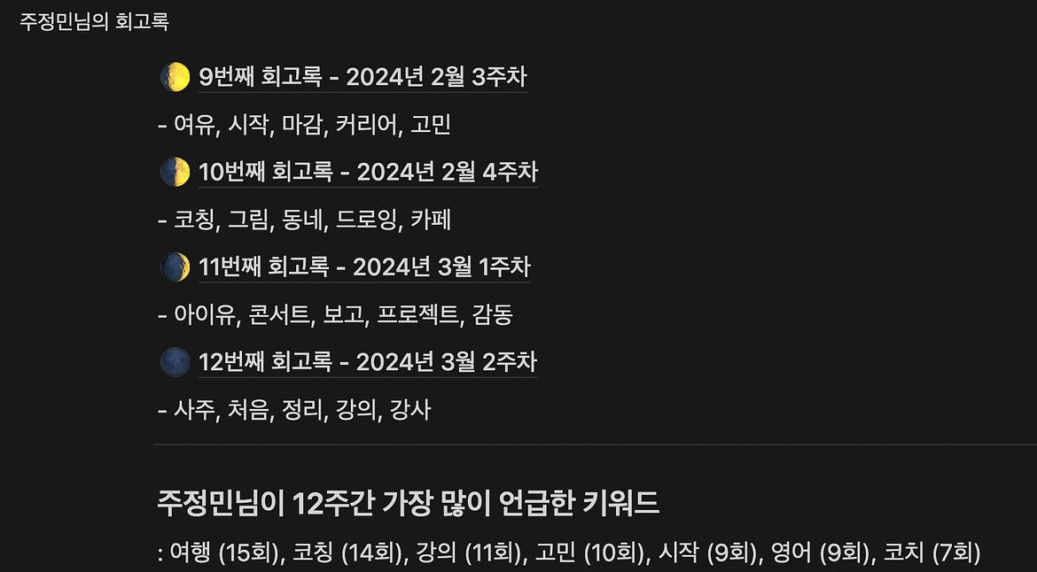 일하면서 느슨해질 수 있었던 시기에 든든한 동료들과 매주 주간 회고를 공유하며 자극을 받았습니다. 메모어 10기, 11기에 이어 지인의 제안으로 14기, 15기는 리유니언 모임으로 꾸준히 참여하여 회고 루틴을 만들고 있습니다. 메모어는 매기수가 끝날때마다 회고를 아카이빙 해주어서 지난 회고를 되돌아볼 수 있다는 점이 좋았습니다.