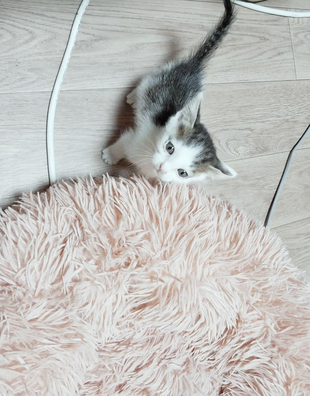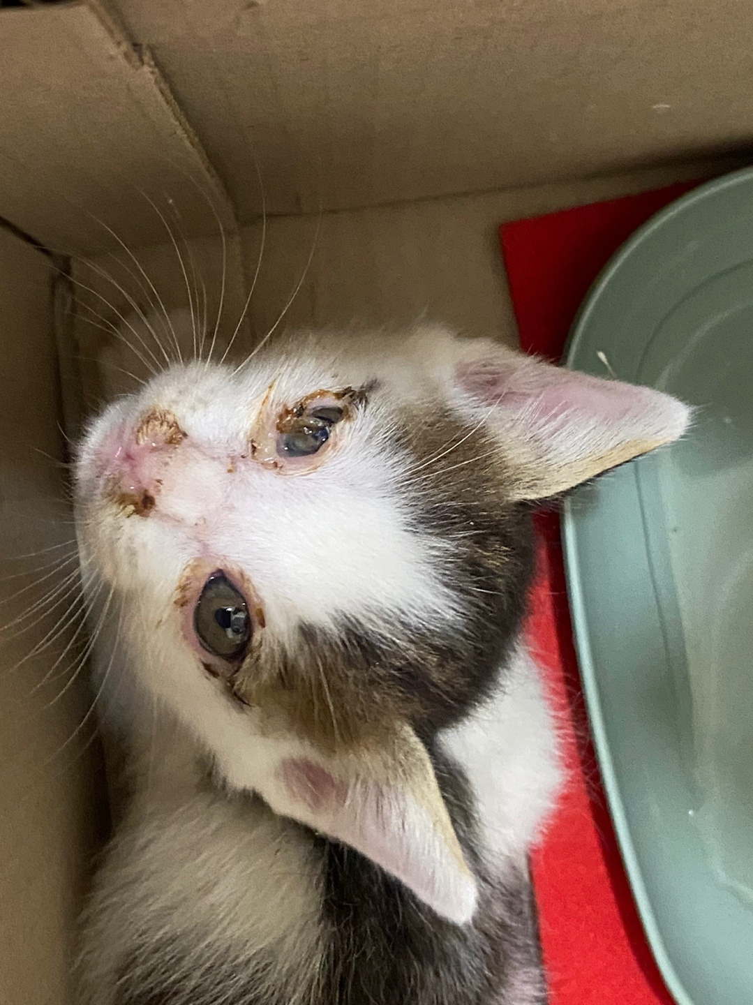 처음 고양이를 발견했을 땐, 집을 찾아 가게 해 주고 싶었다. 그러나 고양이를 가까이서 보니 빠른 시일 내에 눈을 치료하지 않으면 안 될 것 같았다. 주위에 다른 새끼 고양이나 어미 고양이가 없었다.