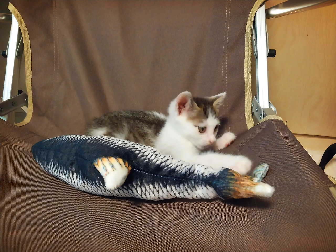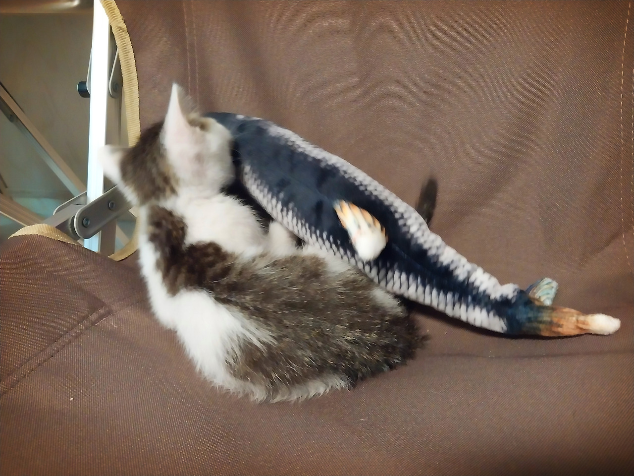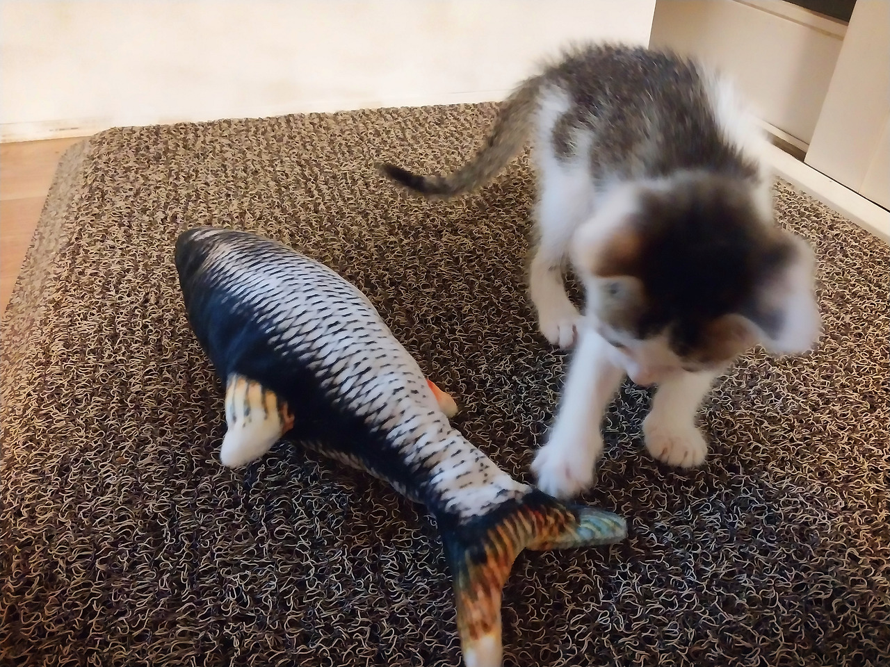자기보다 큰 물고기 인형을 좋아하는 아기냥 동치미