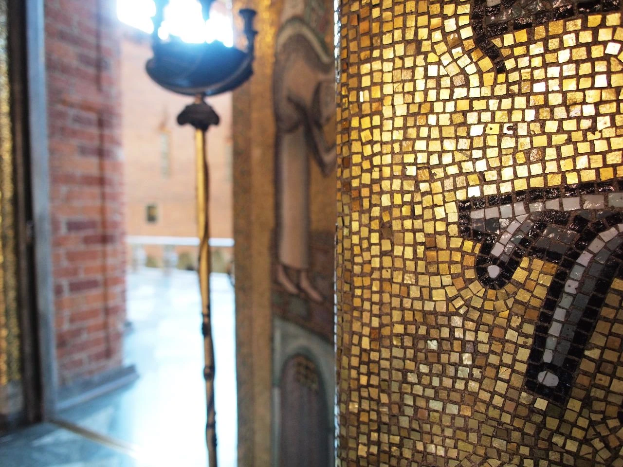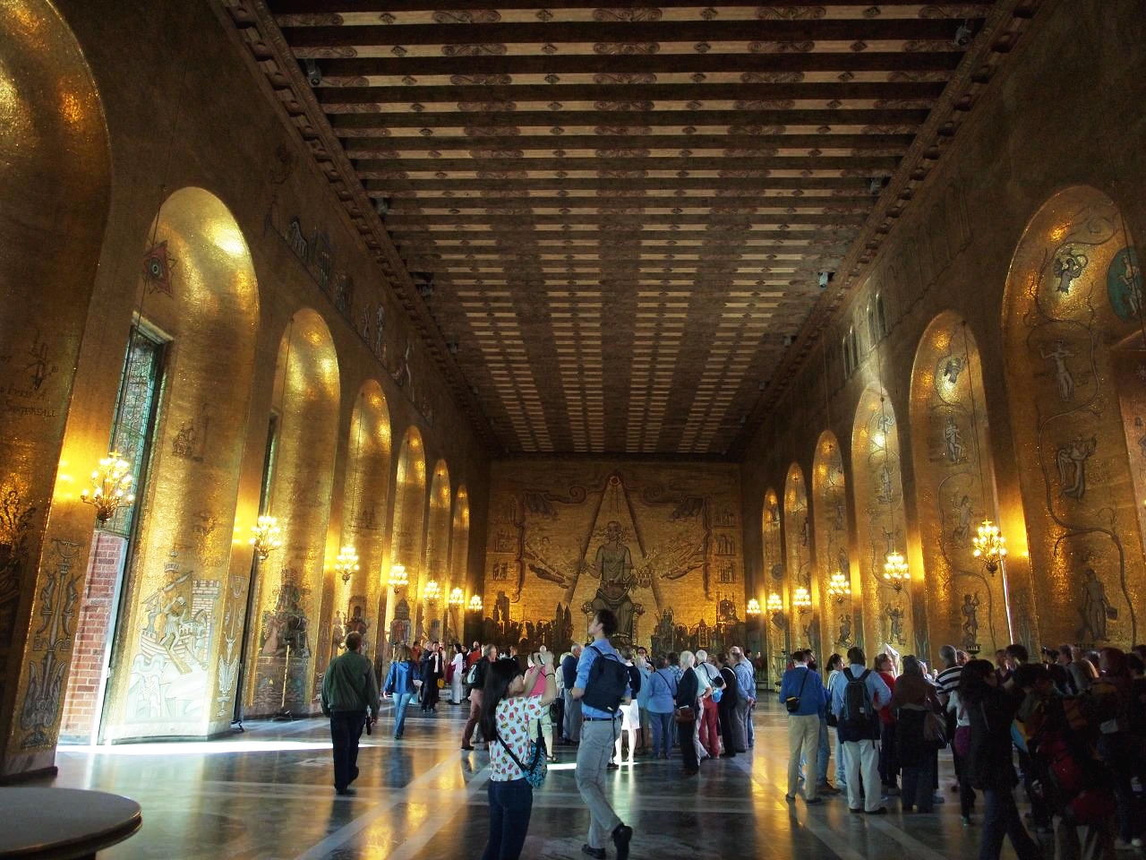 금박을 입힌 세 개의 샹들리에와 중국의 비단으로 장식된 ‘왕관방’을 지나면 마지막으로 시청 투어의 하이라이트를 장식하는 ‘황금의 방’이 나타난다. 이 공간은 700명을 수용하는 대연회장으로, 사면의 벽과 천장이 모두 황금색으로 덮여있다. 호화로움의 극치를 보여주는 1,800만 개의 금박 모자이크 장식이 사방에서 번쩍이자 시끌시끌 사람들의 말이 많아진다. 한쪽 벽면 중앙에는 여성의 모습이 거대하게 모자이크 되어 있는데 멜라렌 호수의 여왕이라고 한다. 여왕의 미모가 참 개성적이라 자꾸만 웃음이 난다. 멜라렌 호수의 아름다움에도 못 미치는 듯하고, 스웨덴의 미녀 이미지와도 거리가 있어 보인다. 여왕이나 여신의 외모를 가지고 이러쿵저러쿵 하기도 그렇고, 꼭 미인이어야 한다는 선입견을 가질 필요도 없지 않냐고 스스로 반성하고 있는데 가이드가 재미있는 사실을 알려준다. 사실 당시에도 여왕의 미모에 대해서 여러모로 불만이 많았는데 이걸 도저히 다시 만들 수가 없어 어쩔 수 없이 내내 스웨덴 사람들로부터 욕을 먹고 있다는 후문. 아무리 그래도 예컨대 이탈리아였다면 바꾸지 않았을까? 블루홀에 블루 컬러가 없어도 이미 유명해져 버린 이름이라고 유지하는 것, 여왕의 아름다움을 표현하는 장식에 실패했어도 이미 다 만들었으니 유지하는 것. 유지하면서 내내 왜 그런지 설명하는 것. 이런 스타일 자체도 어쩌면 스웨덴 사람들의 특징인지도.