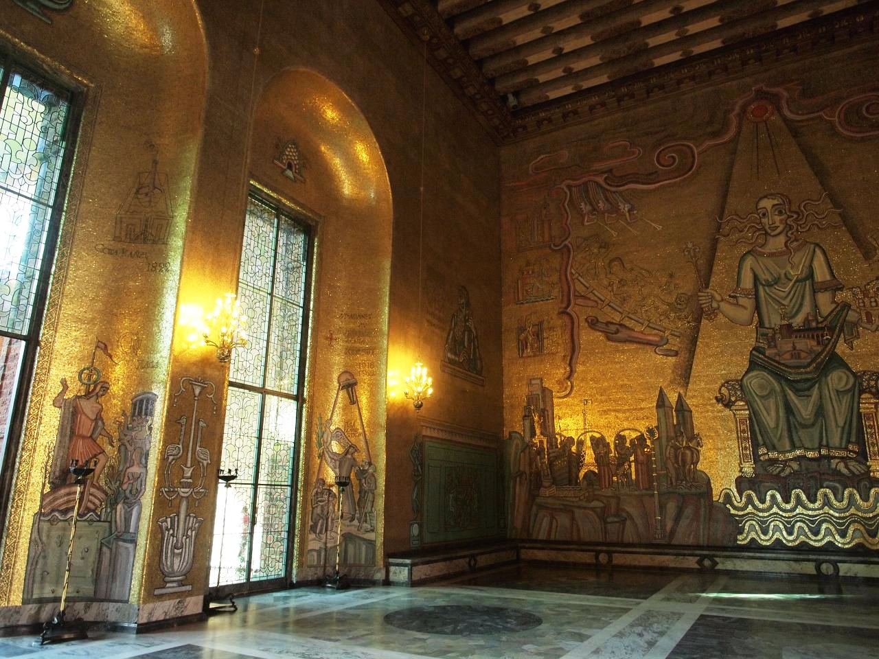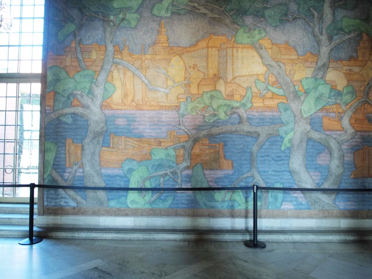 원형방을 지나자 빛이 부드럽게 들어오는 아름다운 복도가 나타났다. 시청사 건축 당시의 국왕은 오스카르 2세였는데 그의 막내아들, 유겐 나폴레온 니콜라스는 왕자이자 화가였다. 멜라렌 호수의 풍경을 사랑했던 왕자는 이 복도에서 보이는 창밖의 풍경을 그대로 반사시켜 창의 반대쪽 벽에 프레스코화를 그렸다. 왕자의 한붓 한붓이 스며있는 이 곳은 그래서 이름도 ‘왕자의 방’이다. 실제로 창 밖을 내다보니 왕자의 마음이 이해가 가고도 남는다. 어마어마한 길이의 벽을 가득 채운 작품을 보고 있자니 왕자의 애정과 열정이 고스란히 전해져 온다.