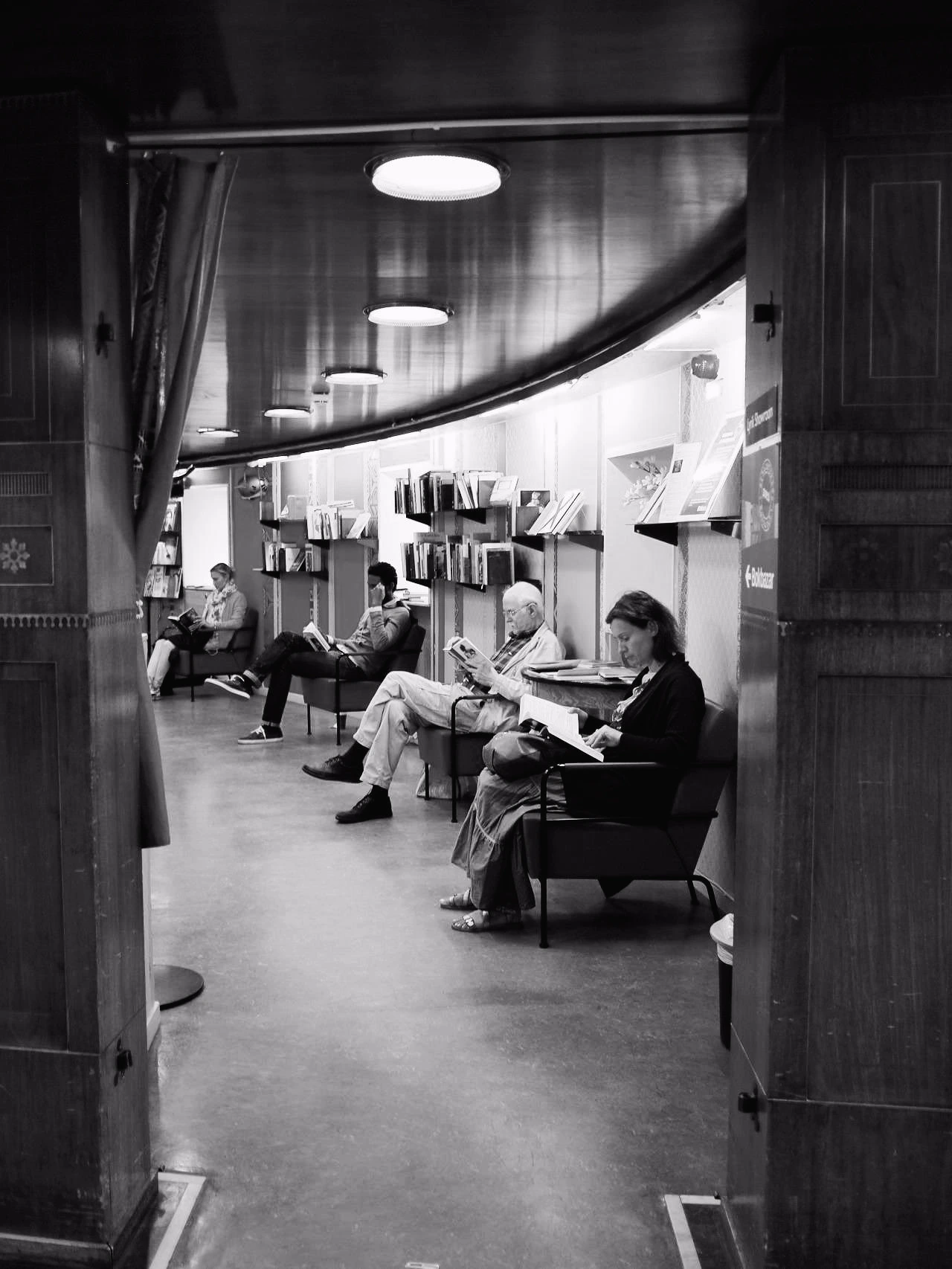 대부분 스웨덴어 책들이라 읽을 수는 없었지만, 무슨 책이라도 꺼내 읽고 싶은 마음이 절로 생겼다. 1층부터 3층까지 장르별로 구분되어 있는 서가를 천천히 걸었다. 얼마 안 되는 영어책 섹션에서 손에 잡히는 대로 한 권 꺼내 펼치니 오래된 책 내음이 난다. 이마저도 좋다. 고요를 깨트리며 여기저기서 책장을 넘기는 소리도 좋다. 책을 고르는 사람과 책을 읽는 사람, 나처럼 구경하러 온 여행객 등 풍경도 제 각각. 서가 뒤편의 좀 더 은밀한 장소에서는 방해받고 싶지 않은 독서 분위기가 한창이다. 백인 여자, 흑인 남자, 백발의 할아버지... 다양한 사람들이 앉아서 조용히 책을 읽고 있다. 책 속으로 빠져들어 집중하고 있는 모습은 언제나 아름답다. 그리고 나는 오늘도 이렇게 스톡홀름에 빠져든다.