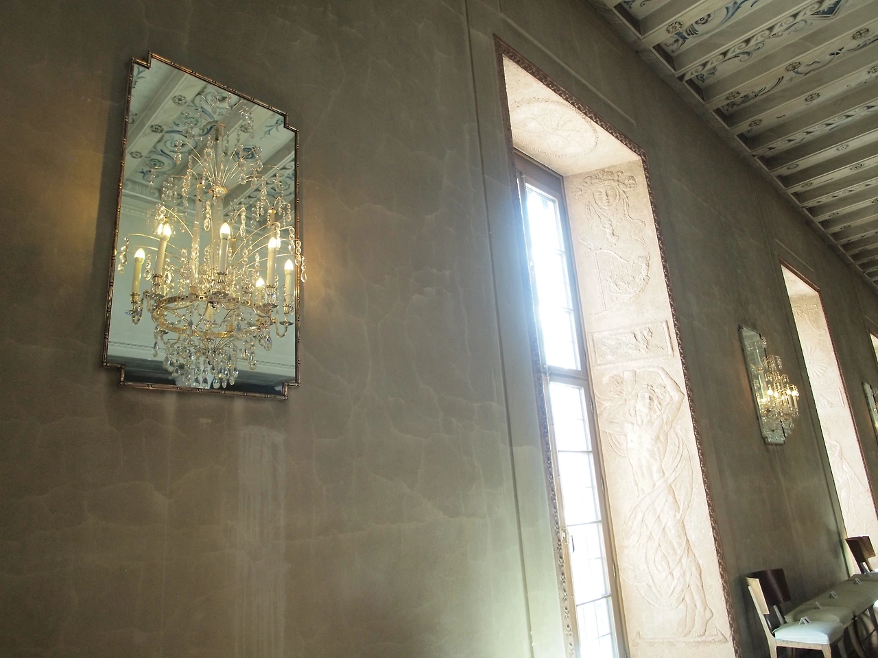 뿐만 아니라 창가 쪽 벽에는 거울에 달려있는 반쪽짜리 샹들리에가 눈길을 끈다. 반쪽 샹들리에가 거울에 비친 반쪽과 만나 온전한 하나로 보인다. 이 또한 이 방의 ‘반사’라는 컨셉에 맞게 장식된 것이다.