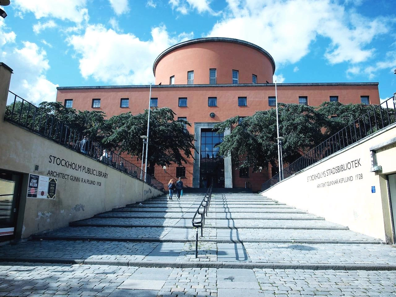 스톡홀름 시립 도서관의 외관은 독특하다. 톤다운된 짙은 살구색의 사각형 건물 위로 같은 색의 나지막한 원통형 기둥이 솟아 있다. 도서관의 살구색은 담장의 상아색과 나무들의 초록색과 함께 어우러지면서 더욱 빛을 발한다. 색감의 조화가 화려하지 않으면서도 세련되어 기분을 좋게 한다. 분명 촌스러울 수 있는 밋밋한 건물인데 볼수록 정감이 간다. 파란 하늘까지 어우러지고 예쁜 폰트까지 가세하니 점점 더 사랑스럽다.