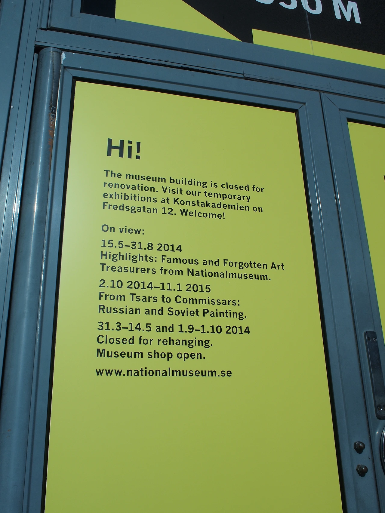 오늘의 마지막 일정인 국립 미술관에 가기 위해 다시 버스를 타고 칼 12세 광장으로 향했다. 국립미술관은 멜라렌 호숫가에 위치해 있어서 들뜬 마음으로 찾아갔다. 그러나 당황스럽게도 문이 닫혀 있었다. 내부 수리 중이라는 내용과 임시 전시장 위치가 입구에 붙어 있을 뿐이었다. 여긴 또 어딘지, 구글맵에 주소를 입력해보니 그리 멀지 않은 위치였다. 참고로, 국립미술관은 2년이 지난 지금도 리모델링 중이다. 2017년 개관 예정이라고. 그들의 '임시(temporary)'가 이렇게 길 줄 몰랐다.