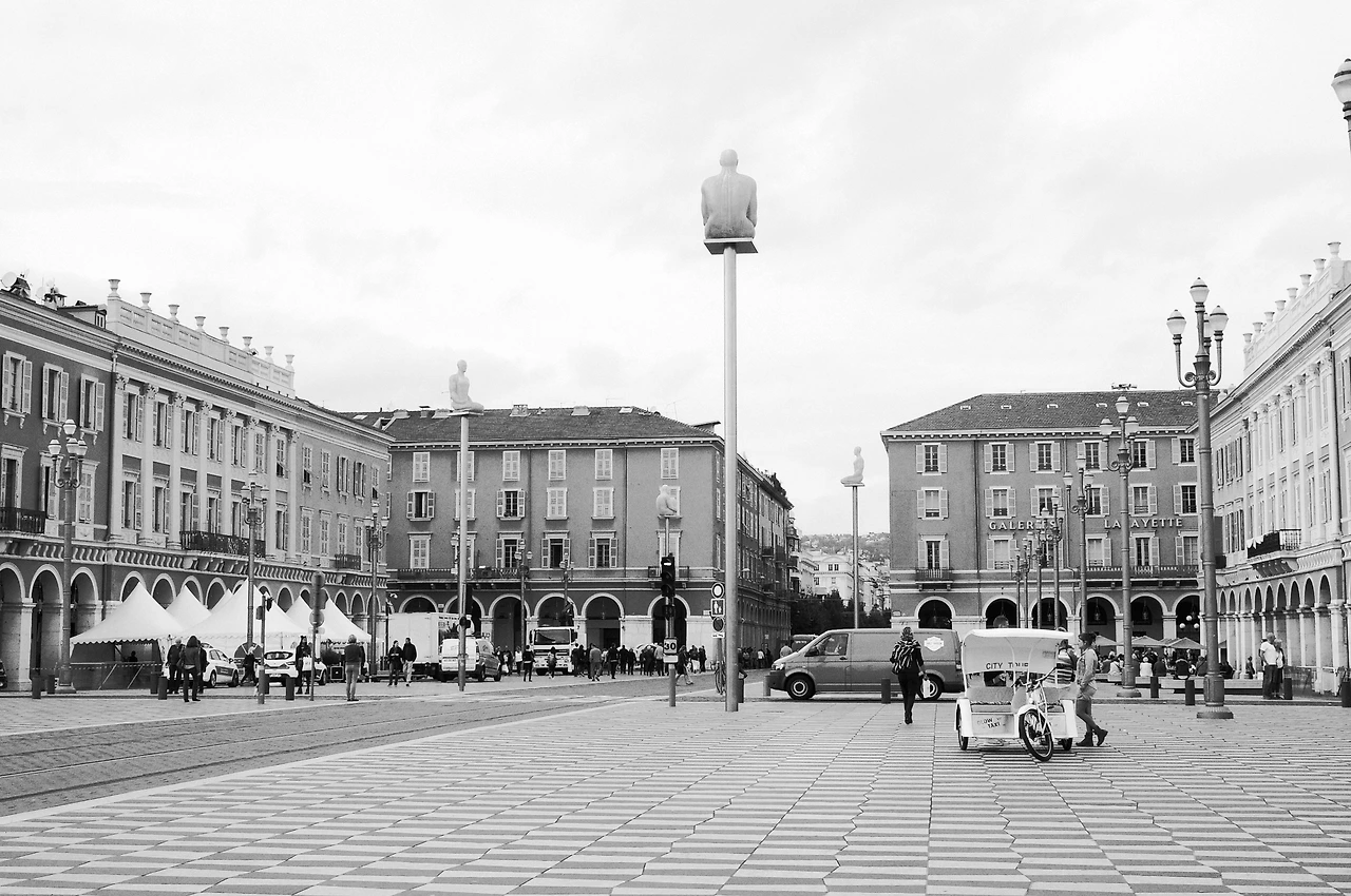 니스의 바다를 보러 가기 전 거치게 되는 마세나 광장. 처음 봤을 때부터 강렬한 인상을 남겼던 인체 조형물들이 이곳의 수호자들처럼 자리하고 있었다. 검색해보니 스페인의 설치 미술가, '하우메 플렌사(Jaume Plensa)'의 작품, [Conversation à Nice]라고 한다. 7개의 좌상들이 대화하는 테마라는데, 정돈된 자세 탓인지 민머리여서 그런지 동양적인 느낌과 함께 독특한 기운을 뿜어낸다.