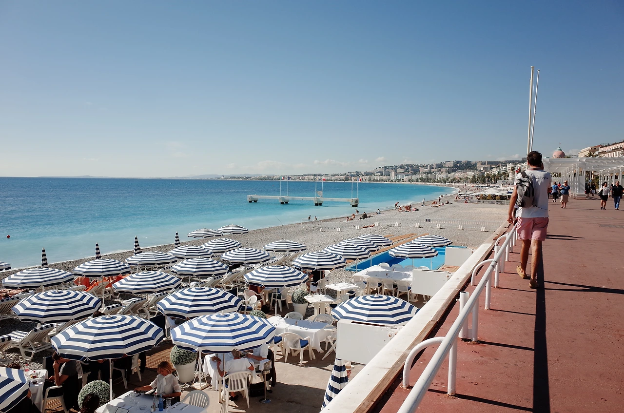 니스 해변의 파라솔 풍경. 파라솔이 있는 곳은 무조건 유료 지대다. 무료로 니스의 바다를 즐기고자 한다면 해변의 자갈과 친해져야 한다.