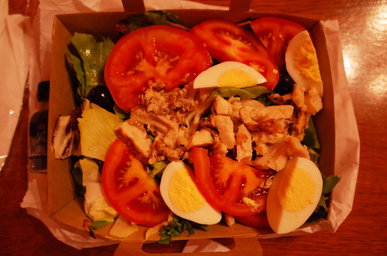 또 한 번은 돼지고기와 삶은 계란, 토마토와 그린 샐러드가 담긴 팩을 5.9유로를 주고 사 왔다. 샐러드에 돼지고기라... 좀 냄새가 나지 않을까 싶었는데 의외로 맛있었다. 발사믹 소스를 뿌려 맛나게 한 끼를 해결했다.
