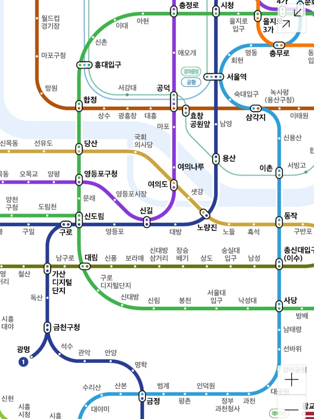 좀 더 짧은 이동 시간을 찾기 위해 다양한 방법을 시도했었다. 먼저 버스를 타고 중간에 2호선, 다시 5호선으로 달리다가 마지막은 버스로도 가보고 또 한 번은 일단 1호선으로 가본 다음 거의 끝무렵에 2호선 그리고 버스로도 가보기도 했다. 한 번은 오기가 나서 그냥 1호선으로 끝까지 타고 올라가다가 3호선,5호선을 이용해 보기도 했지만 총 이동시간은 줄어들지 않았다. 그냥 처음 방법이 가장 빨랐다.