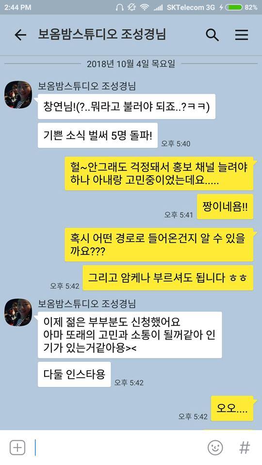 보옴밤 대표님의 엄청난 지원에도 불구하고 '과연 신청하는 사람이 있을까?' 하는 의문은 쉽게 사라지지 않았다. '뭔가 홍보채널을 늘려야 할 것 같은데..." 불안한 마음을 지울 수 없었다. 아내와 이야기하며 혹시 우리 아파트 단지에다 홍보하는건 어떨까 생각해서 알아보니 게시판에 무언가를 부착하려면 부가세 포함 33,000원을 내라는 거였다.(원래 5.5만원인데 주민이라 할인해준다고 함). 돈 쓰는 마케팅을 할 것인가 고민할 시점이었다. 할까말까 살짝 고민했는데 아무래도 이 프로젝트에 돈 쓰는건 아닌거 같아서 이내 포기했다. 뭔가 다른 홍보 방안은 없을까 생각하다가....까똑 까똑이 왔다.