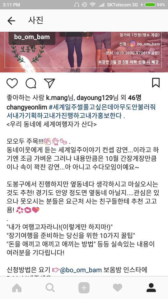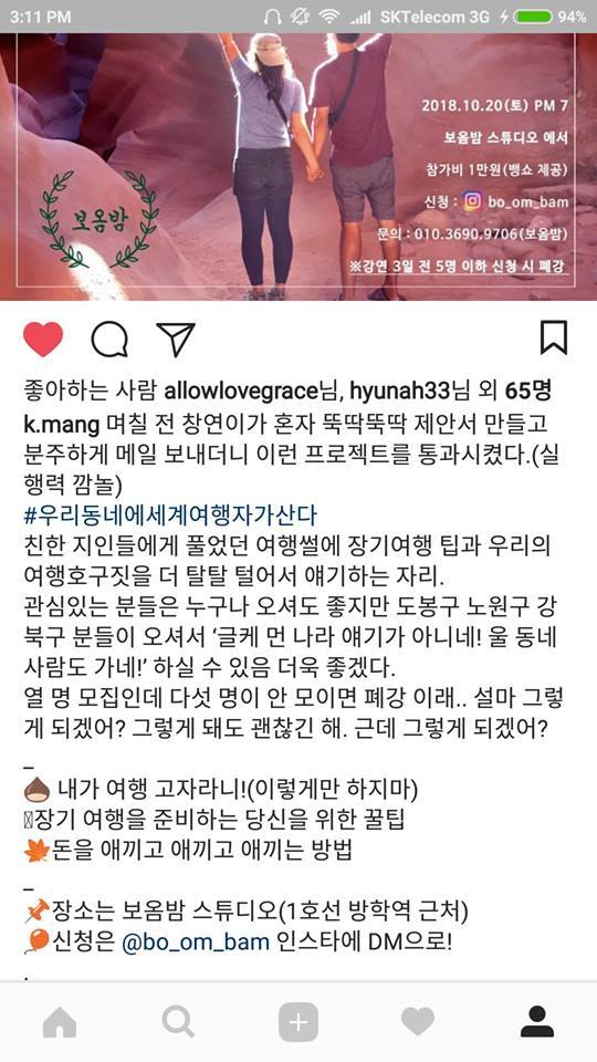 3명의 인스타의 특징에 대해 생각해봤다. 일단 팔로워 수는 아내 > 나 > 보옴밤 순. 그러나 소위 '진성팔로워'는 보옴밤에 따라갈 수 없었다. 우리에게 필요한 팔로워는 '강북구, 도봉구, 노원구 등에 살면서 여행에 관심이 있는 젊은 사람들'이었는데 아무래도 우리의 팔로워는 대부분 지인이다 보니 지역색을 띄기 어려운 면이 있었다. 일단 홍보를 시작하기는 해야 하니 인스타를 통해 시작하기는 했으나 과연 이 정보가 타겟에게 전달될지는 미지수였다. 아니 미지수가 아니라 조금 희박하달까? 나는 부정적이었다. 또 약간의 좌절을 할 무렵 우리 천사같은 보옴밤 대표님이 추가 홍보방안을 생각해 주셨다.