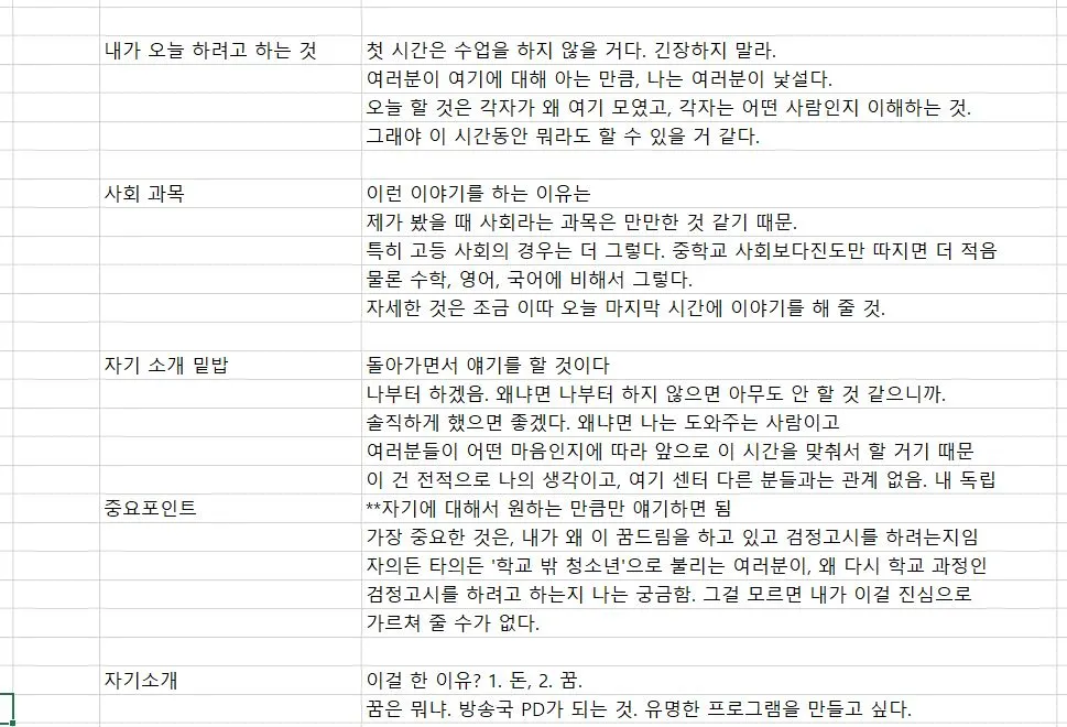 “안녕하세요, 저는 조정환이라고 하는 사람이고요. 아시다시피 사회 과목이에요.” 그렇게 시작했다. 어젯밤에 잔뜩 준비한 말을 이어갔다. 물론, 존댓말로.