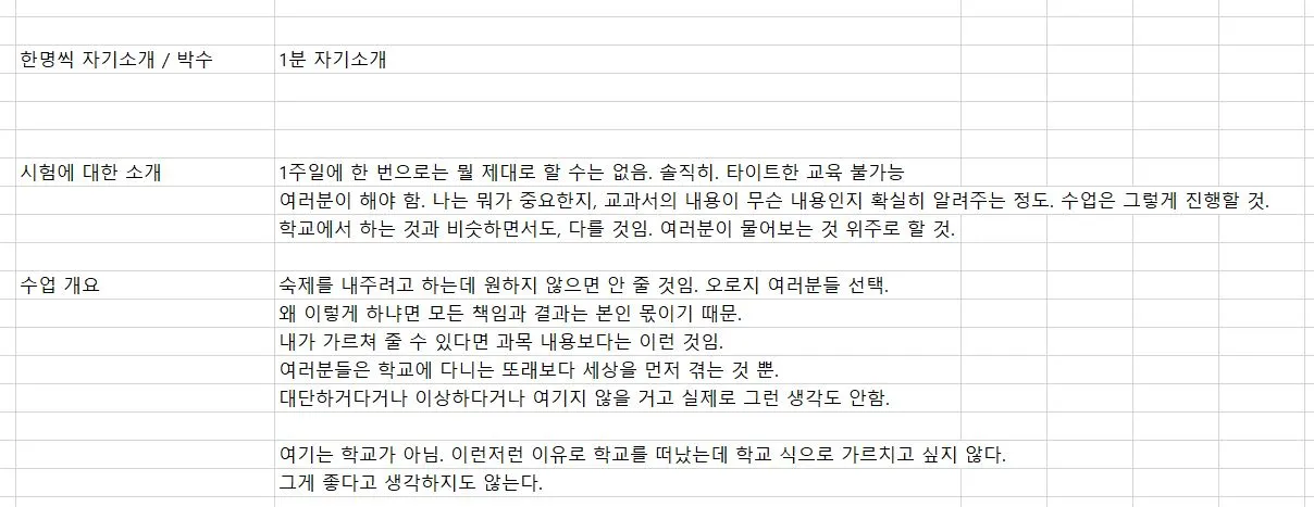 여기까지 이야기가 흘렀을 때, 학생들은 당황하는 듯 보였다. ‘딴 과목 가르치는 선생들이랑 완전 다른 놈인데 이거...’라고 생각하는 듯한 표정이었다. 이런 얘기로 수업을 시작하는 사람이 없었나?