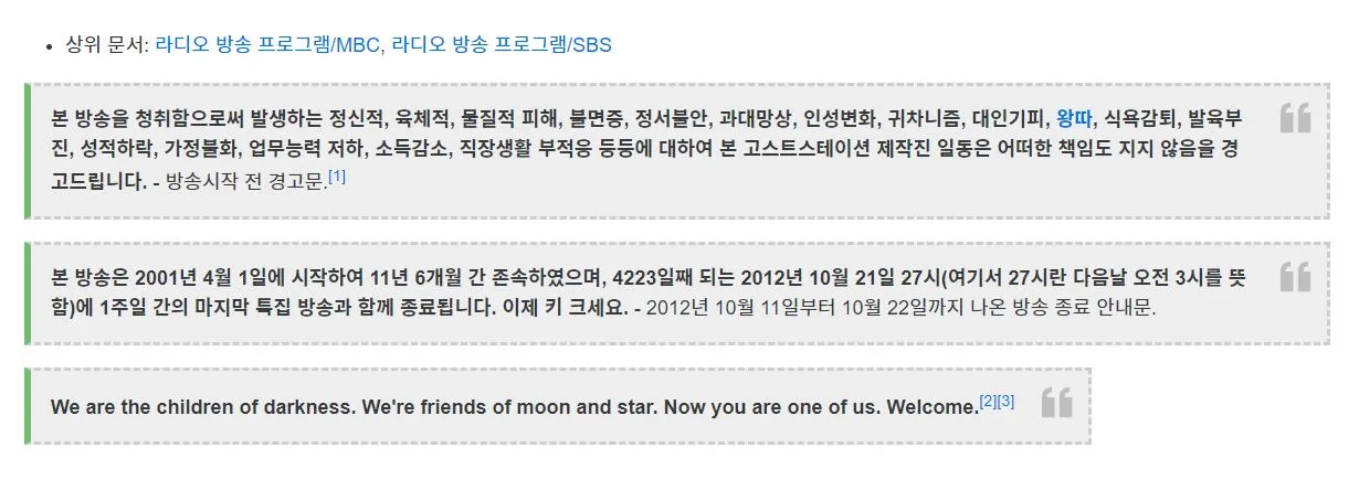 그 이후로 나는 점점 어둠의 자식이 되어갔다. 틈이 날 때마다 고스트네이션(이하 '고스')을 들었다. 묘한 매력이 있었기 때문이다. 기존 방송과는 아예 달랐다. 일단, 고스는 신청곡을 받지 않는다. 게스트도 없다. 60분 내내 수다만 떠는 경우가 부지기수. 반대로 한 시간 내내 노래만 나오기도 한다. 혹시 22분짜리 트로트 삼태기 메들리를 아는가? 마왕은 아무렇지 않게 튼다. 그런 걸 틀고 좋아한다. 이렇게 변태 같은 DJ라니... 가끔은 끝나기 10분 전에 낯선 목소리가 나온다. “작가입니다. 마왕님이 방금 친구가 나이트에서 놀고 있다는 전화를 받고 가버렸습니다. 대신 노래 틀어드리겠습니다.” 지금 봐도 기가 찬다.