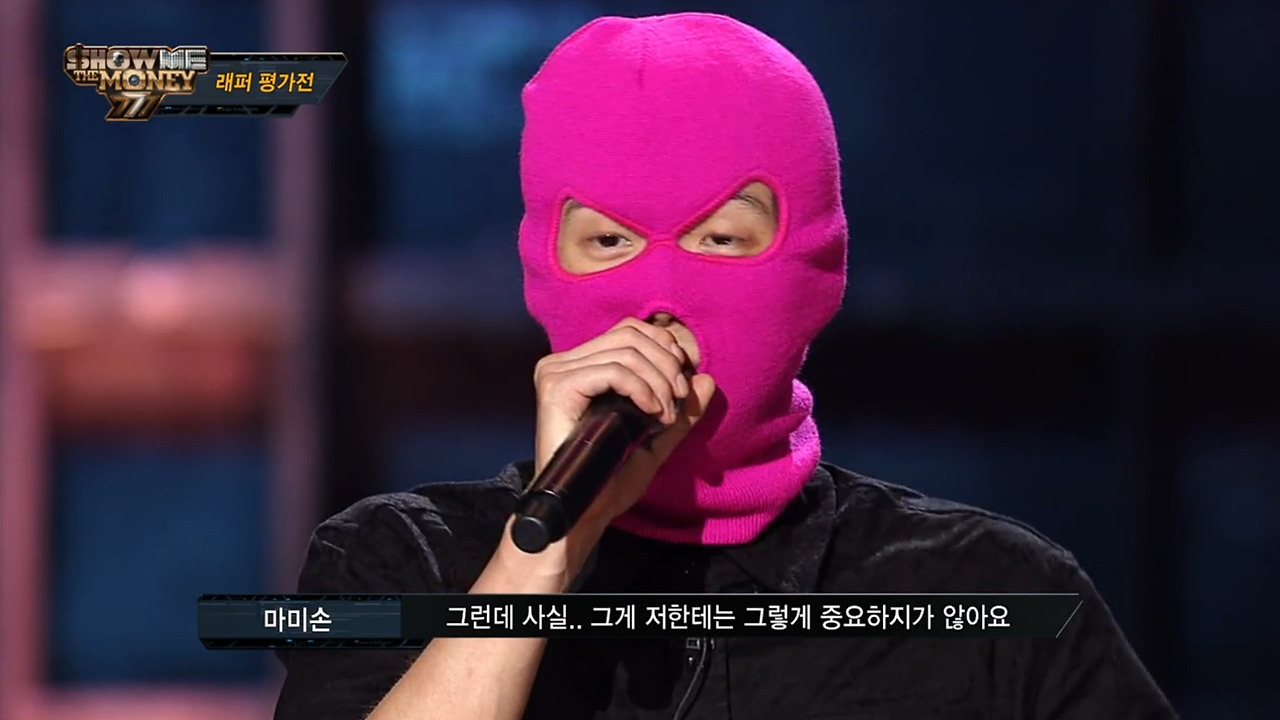 비판에 대한 그의 답은 ‘마미손’. <쇼미더머니777>, 맫씨는 복면을 쓰고 지원서를 냈다. 다른 사람들과 똑같이 줄에 서서 대기했다. <쇼미2> 때 모습 그대로였다. 어수룩한 모습으로 앉아 눈만 꿈뻑꿈뻑. 사실 모두가 그를 안다. 제작진뿐 아니라 참가자, 심사위원까지. 핑크색 복면 정도로 정체가 가려질 리 없다. 하지만 맫씨는 끝까지 복면을 벗지 않았다. 그리고 수많은 기성 래퍼들이 쓰러졌던 불구덩이에 선다.