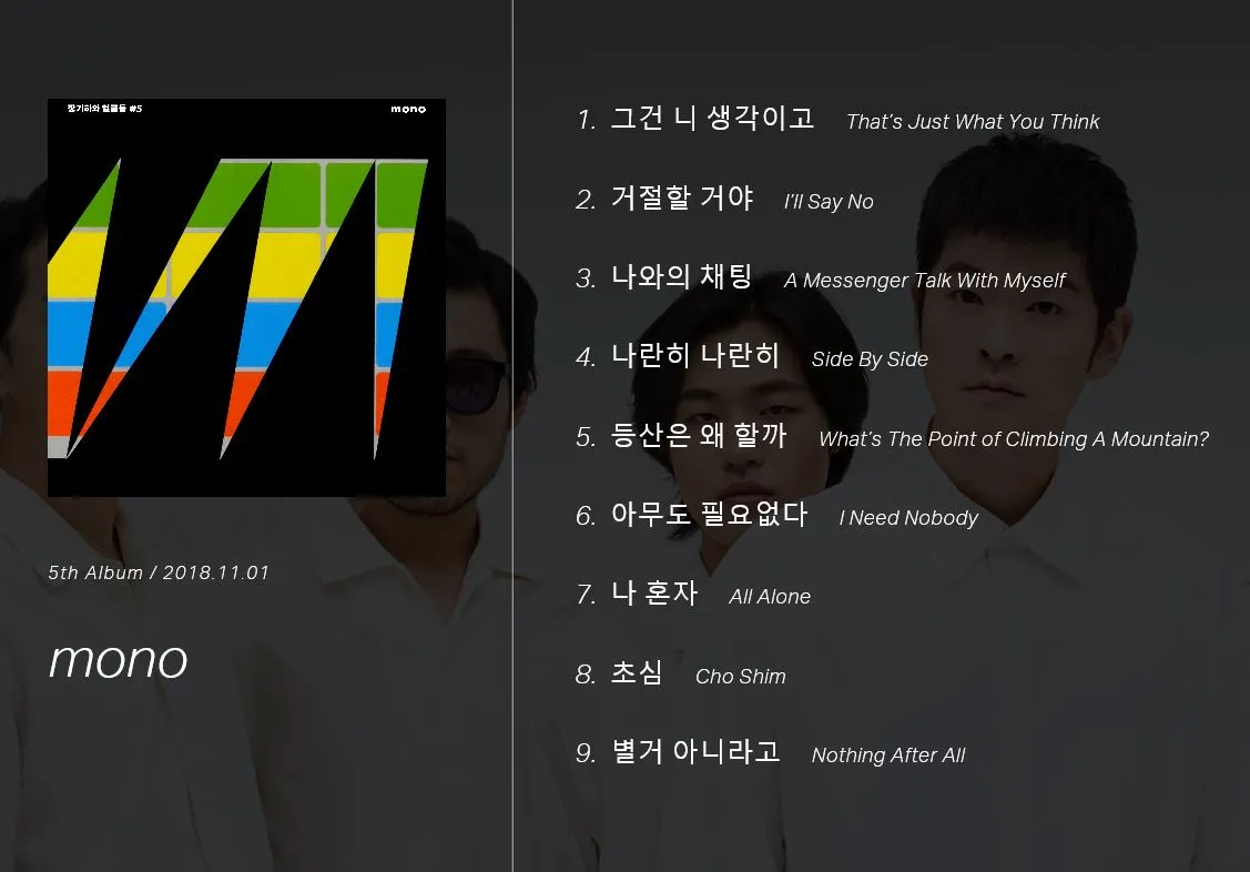 초심을 향한 고민, 답은 해체였던 것 같다. 곳곳에 이별이 쓰여 있다. 앨범 제목부터 <mono>다. 사운드가 하나의 채널에 형성되는 것을 일컫는 용어, 쉽게 말해 홑 채널. 스테레오도 모자라 서라운드가 당연한 지금 이 시대에.