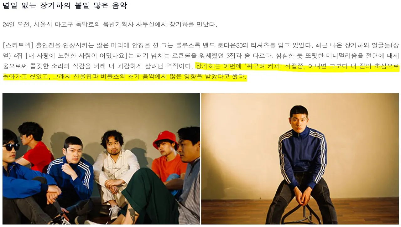 초심을 찾아야만 한다는 마음, 새 앨범은 어때야 한다는 마음, 장얼다워야 한다는 마음... 이런 거 사실 어느 한 모습을 향한 집착 아닐까? 물은 물로 존재해야 한다고 생각하는 것처럼, 한때의 모습을 영원히 고정된 개념으로 보는 것이다. 싸구려 커피를 찾을 때의 장기하는 당시의 연들에 의해 만들어졌다. 지금의 장얼은 그때와 다른 새로운 연들로 인해 일어났다. 그들은 10년 동안 많은 일을 겪었고 성장을 했을 거다. 그냥 그거다. 그래서 자신 있게 얘기할 수 있는지도 모른다. 옛날에 내가 어떤 놈이었는지 기억이 안 난다고.